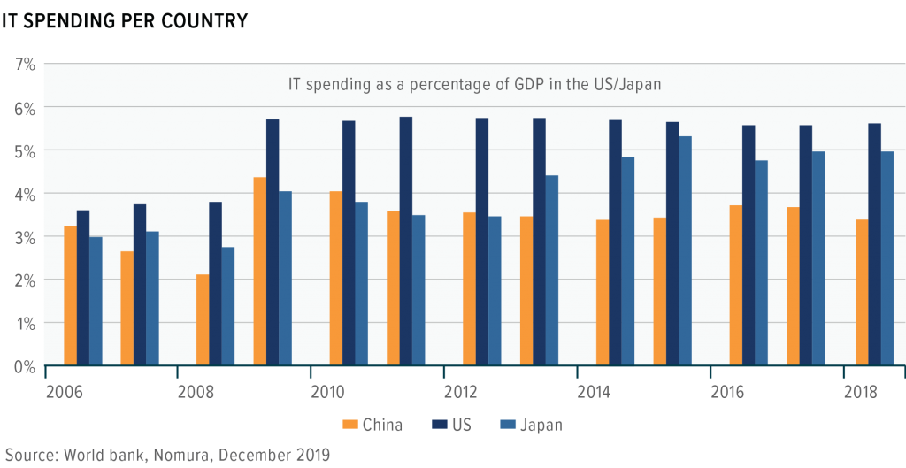 China’s IT service spending is a mere 3.9% of global IT spending in 2018, while the country’s GDP share in global GDP is as high as 15.7%. In fact, the pace of growth of IT service spending in China has experienced acceleration, particularly over the last three years owing to the faster development of the IaaS industry coupled with rising enterprise user awareness and general acceptance for cloud computing services. Finally, government policy support served as an invisible hand, pushing technology penetration to a higher level.