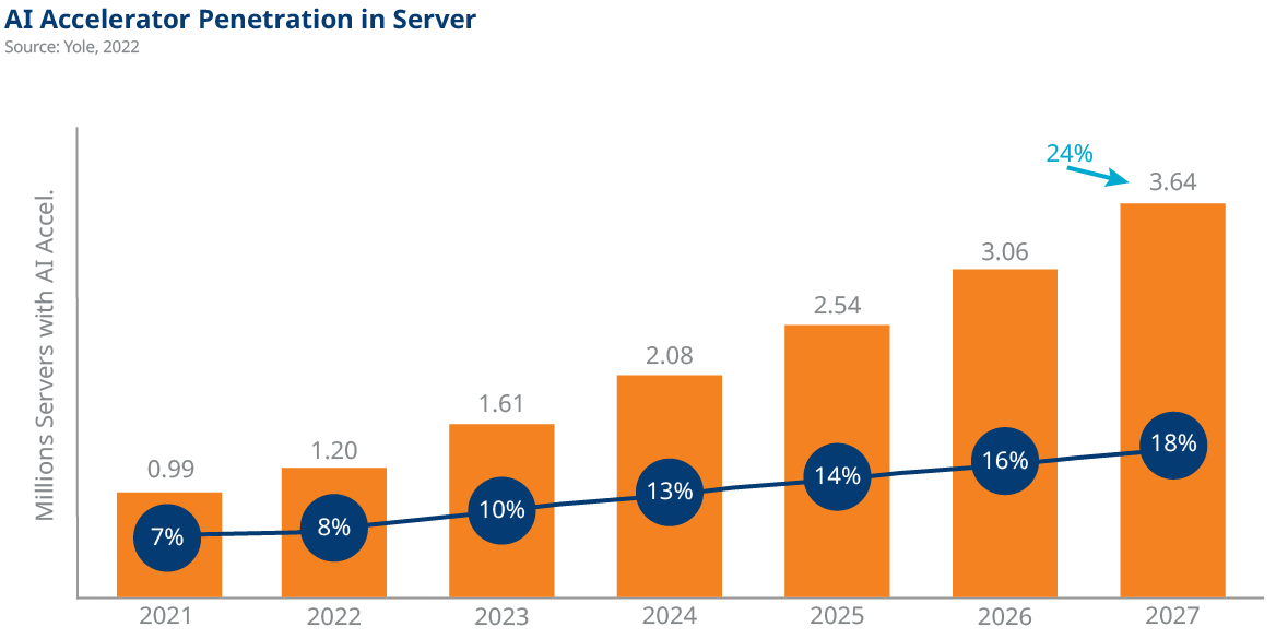 Asia and China’s semiconductor industries should benefit from the infrastructure investment required for generative AI. The development of advanced AI models and the ensuing blossom of new products will require significant investment in computing power to support its operations. Yole projects AI accelerator penetration to increase from 8% in 2022 to 18% in 2027, representing a CAGR of 24% from 2021 to 20276. This will benefit Asia and China’s high-performance computing-related semiconductor supply chains, including: