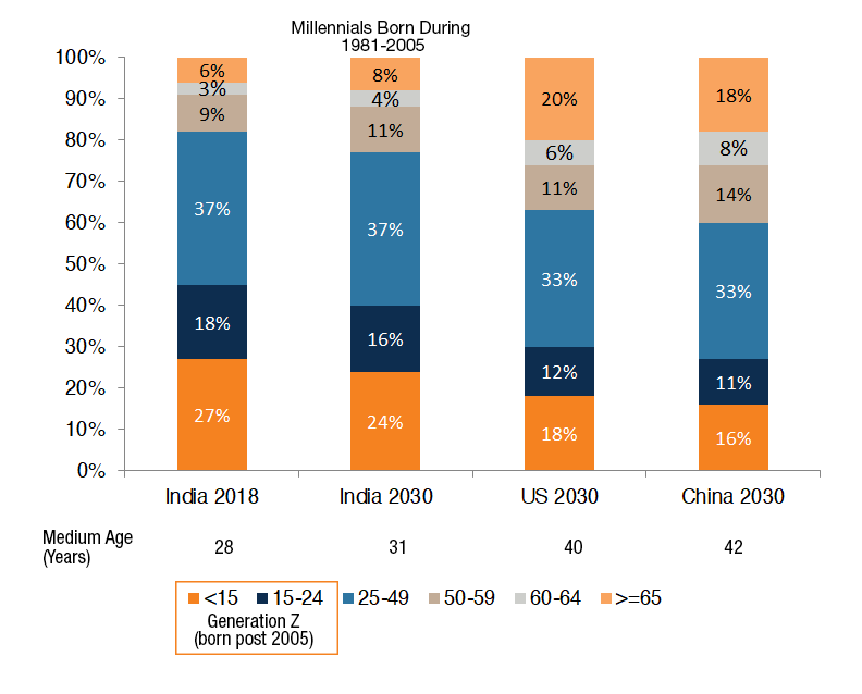 With its demographic dividend expected to last till 2055, India will be dominated by a young and tech-savvy generation. By 2030, millennials and Generation Z will comprise 77% of the total population. Generation Z will itself consist of 370 million people – ‘digital natives’ who will be accustomed to and even prefer technology-enabled consumption models.