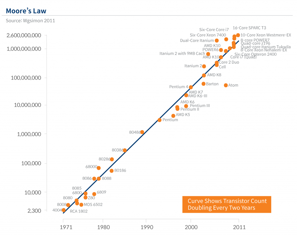 Foundry process migration works on shrinking the distance between transistors, which has allowed more transistors to be packed into a fixed area, achieving higher logic density with better power efficiency. Gordon Moore, the co-founder of Fairchild and Intel, predicted that the number of transistors in integrated circuits doubles about every two years back in 1975, which has since become known as the ‘Moore’s law’. This enables the industry to make faster Central processing unit (CPUs) and larger memories. Today the smartphone in your pocket is much more powerful than the Apollo 11 guidance computer.