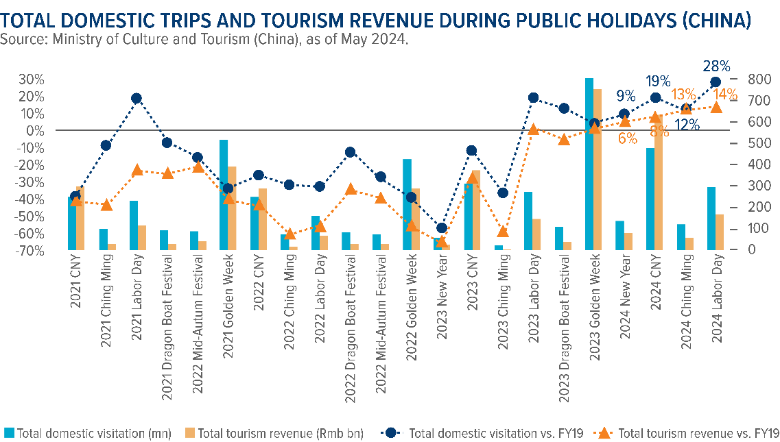 - For the Labor Day holiday, total China domestic traffic was 295mn on May 1 – 5th, 8% YoY, according to the Ministry of Culture and Tourism. This is a 28% increase vs. FY2019 levels, an improvement from +19%/+12% during the CNY and Qingming holidays. Tourism revenue came in at Rmb167bn, +14%25 vs. FY2019 levels, implying that each traveler still spent less than what they used to pre-Covid.