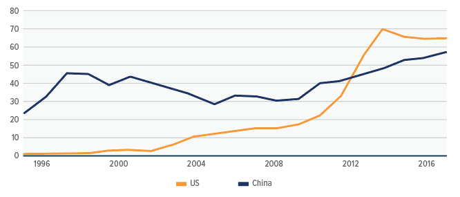 The country’s increasing dominance is reflected in the number of biotechnology patents granted, rising from 1,000+ to 6,000+ in 2006 – 2016, with a percentage increment from 12% to 27%. In 2012, China even surpassed the US in this area.